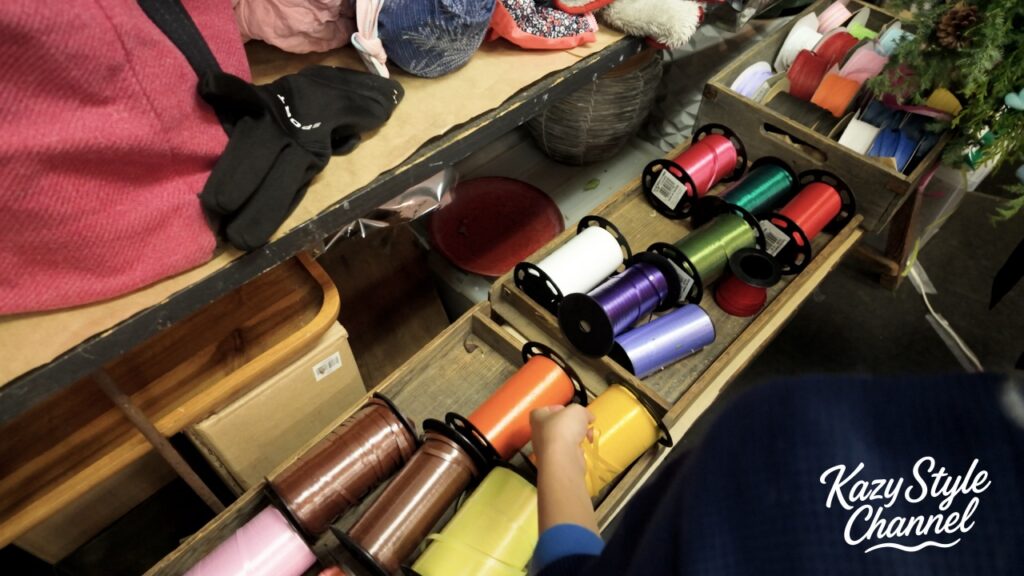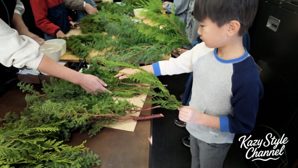 ワークショップでは、枝を背の順に重ねて束ね(紐でしっかり固定してくれるのはお店の方)、