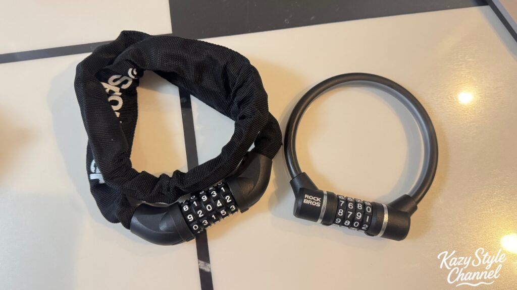 今まではゲレンデでボードを盗られないように使っていたワイヤーロックしか持っておらず、さすがに自転車用としては不安に…。